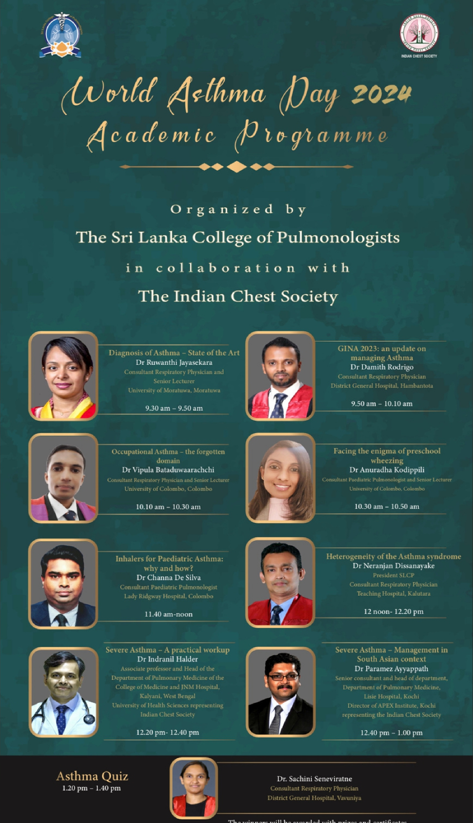 The Sri Lanka College of Pulmonologists in collaboration with the Indian Chest Society organised a 4 hour long Academic programme on the occasion of the World Asthma Day 2024 on 6th May 2024. It was held physically at the ClinMARC Auditorium, National Hospital of Sri Lanka and also broadcasted live for the audience of both nations.